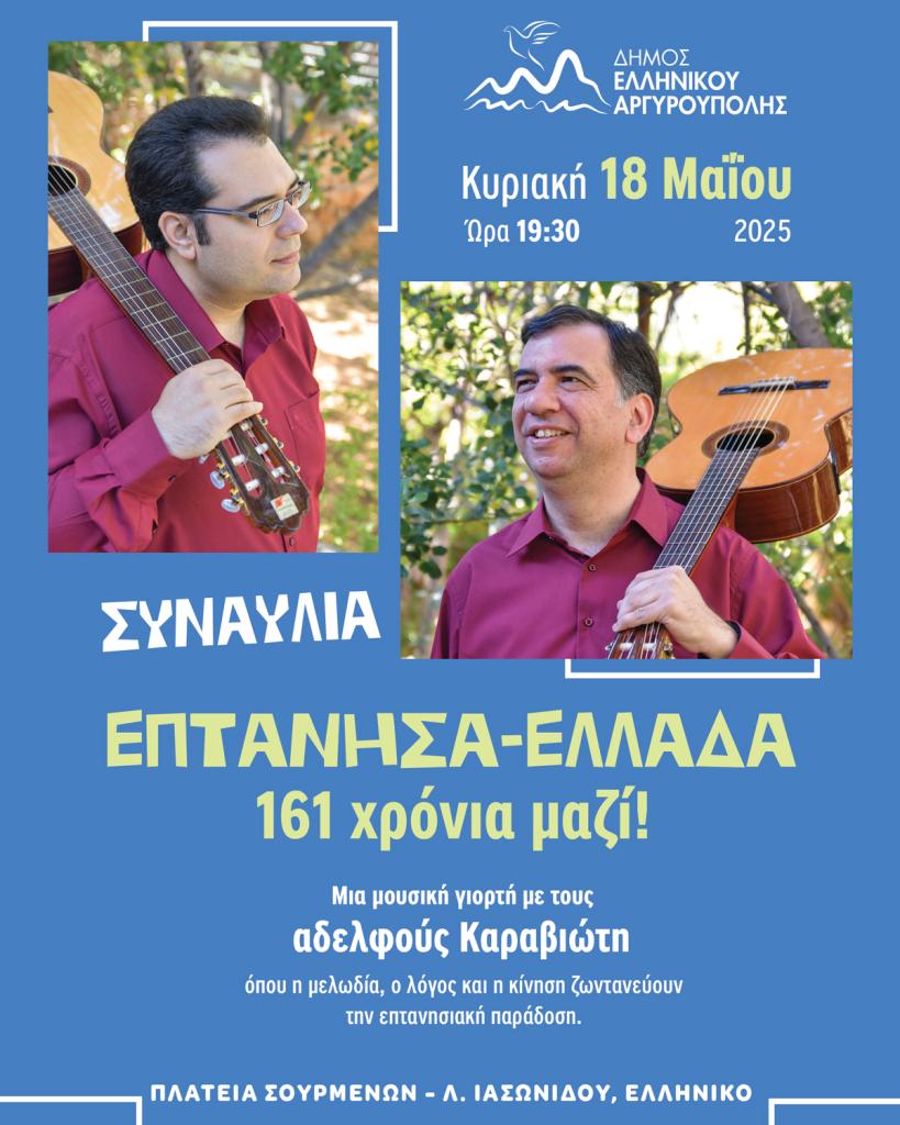 Την Κυριακή 18 Μαΐου στις 19:30, η πλατεία Σουρμένων στο Ελληνικό, θα πλημμυρίσει από μελωδίες και καντάδες, με τη μοναδική ερμηνεία των αδελφών Σπύρου και Μάκη Καραβιώτη.