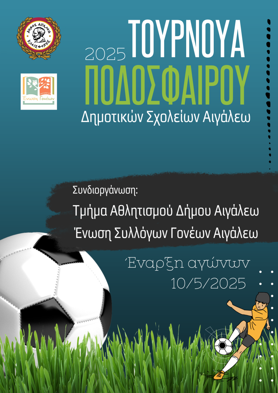 Με στόχο την ενίσχυση της ομαδικότητας, την προώθηση του «ευ αγωνίζεσθαι» και την καλλιέργεια του σεβασμού και της αλληλεγγύης μέσα από το ποδόσφαιρο, ο Δήμος Αιγάλεω, μέσω του Τμήματος Αθλητισμού και σε συνεργασία με την Ένωση Συλλόγων Γονέων Αιγάλεω, διοργανώνει Τουρνουά Ποδοσφαίρου για τους μαθητές και τις μαθήτριες των Δημοτικών Σχολείων της πόλης μας.
