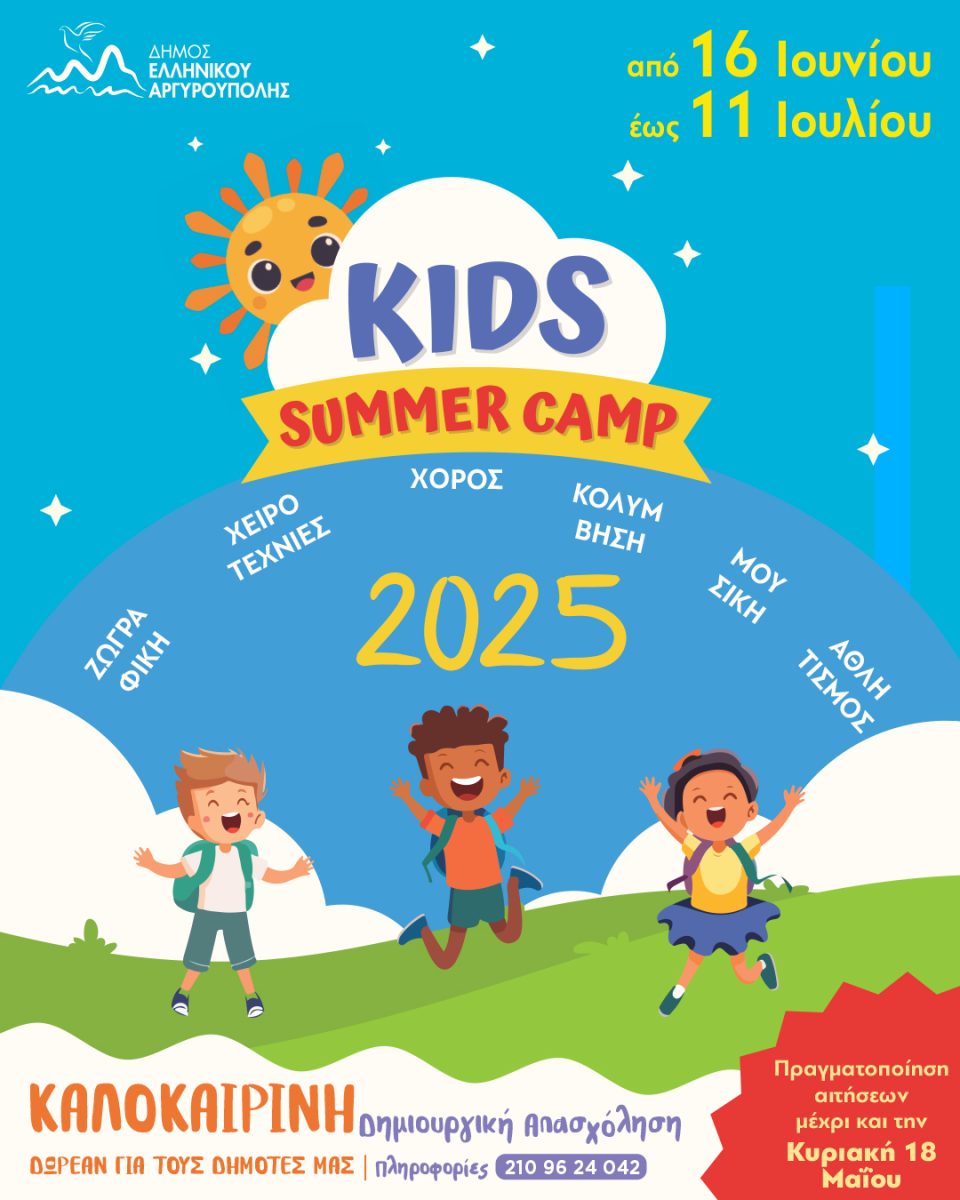 Και φέτος, τα παιδιά της πόλης μας θα έχουν την ευκαιρία να ζήσουν το πιο αξέχαστο καλοκαίρι! Με πολλές εκπλήξεις και δημιουργικές δράσεις, το “Summer Camp” του Δήμου Ελληνικού – Αργυρούπολης προσφέρει καλοκαιρινές αθλητικές, καλλιτεχνικές και ψυχαγωγικές δραστηριότητες για όλα τα παιδιά του Δήμου μας που έχουν γεννηθεί από το 2013 μέχρι και το 2019, χωρίς καμία οικονομική επιβάρυνση για τους δημότες μας.