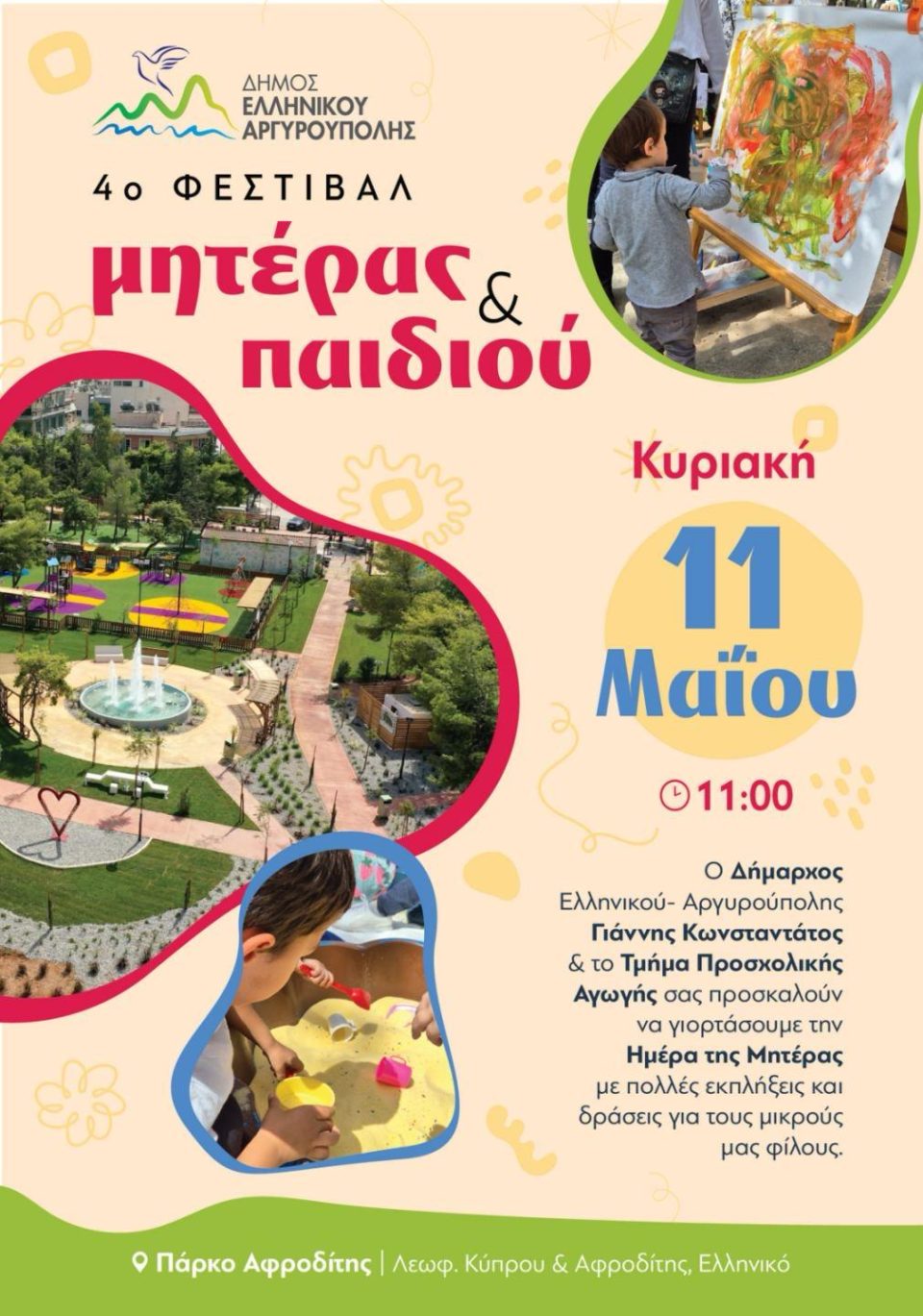 Ο Δήμος Ελληνικού – Αργυρούπολης και το Τμήμα Προσχολικής Αγωγής, τιμώντας την Γιορτή της Μητέρας, προσκαλεί μικρούς και μεγάλους στο «4ο Φεστιβάλ Μητέρας – Παιδιού», την Κυριακή 11 Μαΐου στις 11:00 π.μ., στο Πάρκο Αφροδίτης (στη συμβολή της Λ. Κύπρου και της οδού Αφροδίτης, στο Ελληνικό).