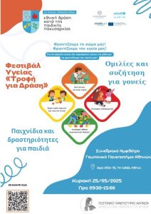 Στο πλαίσιο της Εθνικής Δράσης για την Αντιμετώπιση της Παιδικής Παχυσαρκίας, που υλοποιείται από το Υπουργείο Υγείας σε συνεργασία με τη UNICEF, διοργανώνεται Φεστιβάλ Υγείας για Παιδιά και Οικογένειες, το οποίο θα πραγματοποιηθεί το Κυριακή 25 Μαΐου, από τις 9:30 π.μ. έως 3:00 μ.μ., στο Γεωπονικό Πανεπιστήμιο Αθηνών.
