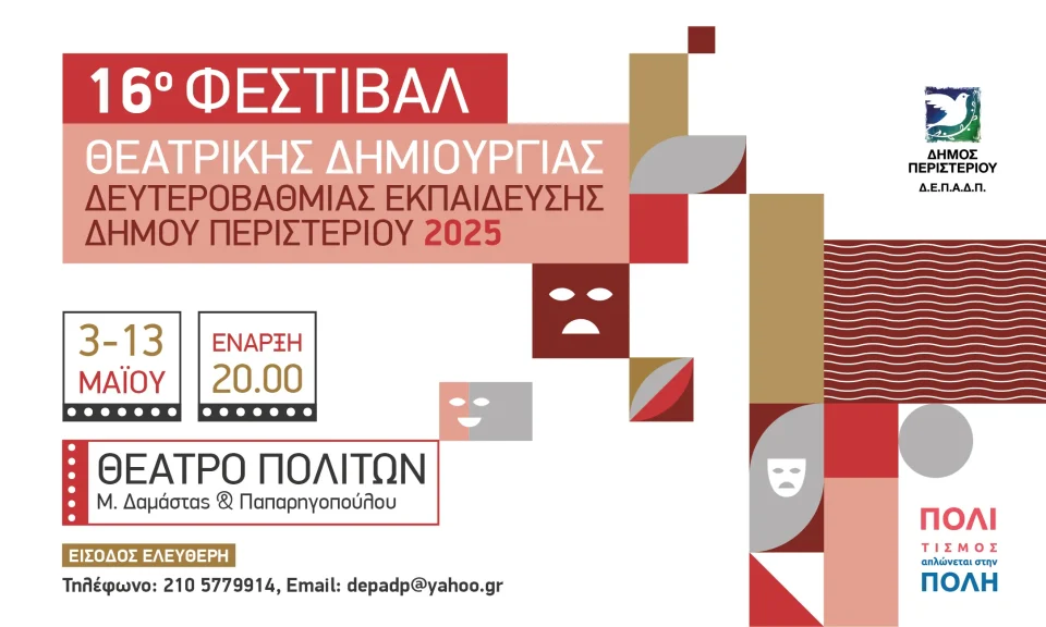 Το Φεστιβάλ Θεάτρου Δευτεροβάθμιας Εκπαίδευσης, που διοργανώνεται για 16η χρονιά από την Κοινωφελή Δημοτική Επιχείρηση Πολιτιστικής Ανάπτυξης Δήμου Περιστερίου (ΔΕΠΑΔΠ), αποτελεί πλέον έναν θεσμό με σταθερό αποτύπωμα στην εκπαιδευτική και καλλιτεχνική ζωή του τόπου.
