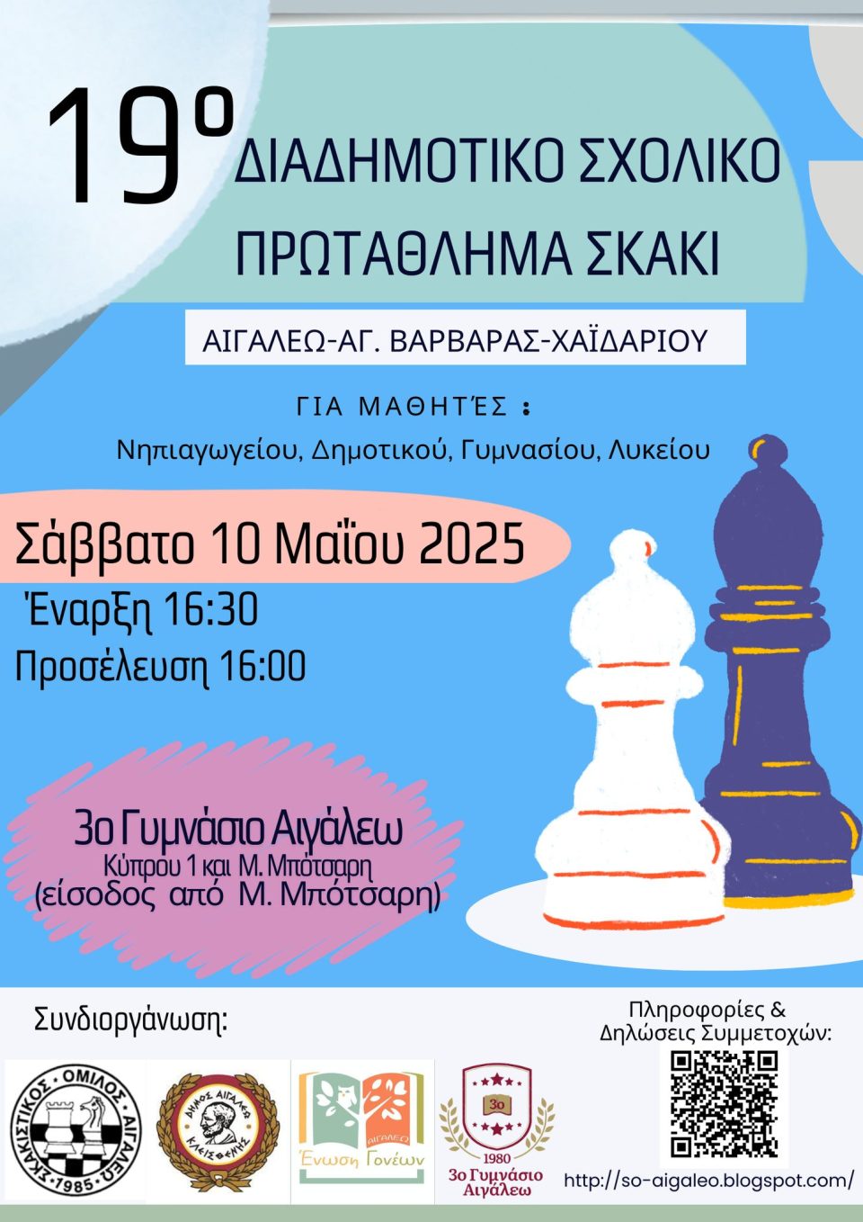 Με στόχο την καλλιέργεια της στρατηγικής σκέψης, του ευ αγωνίζεσθαι και της δημιουργικής έκφρασης των παιδιών μέσα από το σκάκι, ο Δήμος Αιγάλεω, ο Σκακιστικός Όμιλος Αιγάλεω και η Ένωση Γονέων Αιγάλεω, με τη συμβολή του 3ου Γυμνασίου Αιγάλεω, διοργανώνουν το 19ο Διαδημοτικό Σχολικό Πρωτάθλημα Σκάκι των Δήμων Αιγάλεω, Χαϊδαρίου και Αγίας Βαρβάρας.