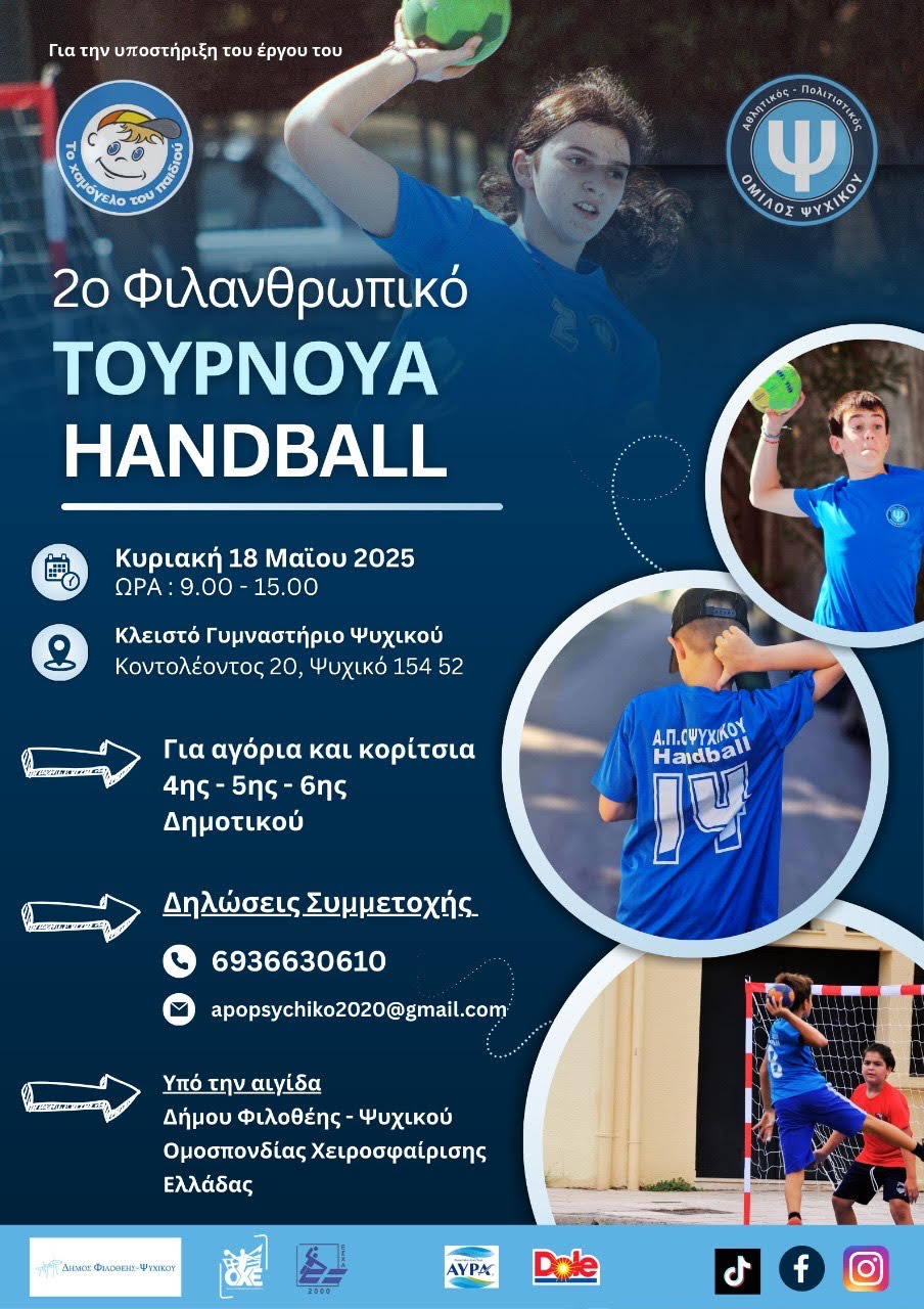 Το 2o Φιλανθρωπικό Τουρνουά Χάντμπολ υπό την αιγίδα του Δήμου Φιλοθέης – Ψυχικού και την Ομοσπονδίας Χειροσφαίρισης Ελλάδος, διοργανώνει την ερχόμενη Κυριακή, ο Αθλητικός και Πολιτιστικός Όμιλος Ψυχικού (ΑΠΟΨ) σε συνεργασία με τον εθελοντικό μη κερδοσκοπικό οργανισμό «Το Χαμόγελο του Παιδιού».