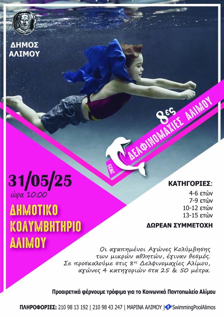 Οι αγαπημένοι Αγώνες Κολύμβησης των μικρών αθλητών, έγιναν θεσμός. Οι 8ες Δελφινομαχίες Αλίμου, αγώνες 4 κατηγοριών στα 25 & 50 μέτρα, θα πραγματοποιηθούν το Σάββατο 31/5/2025, στο δημοτικό κολυμβητήριο της πόλης.