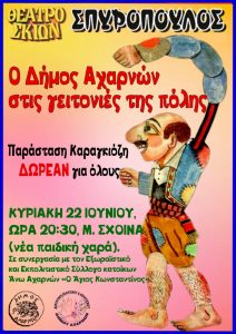 Την Κυριακή 22 Ιουνίου 20:30, στη νέα παιδική χαρά (Μεγάλα Σχοίνα), θα πραγματοποιηθεί παράσταση Καραγκιόζη, με ελεύθερη είσοδο για όλους.