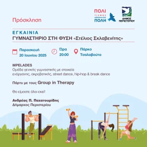 Ο Δήμος Περιστερίου προσκαλεί όλους τους πολίτες στα εγκαίνια του νέου, σύγχρονου Γυμναστηρίου στη Φύση «Στέλιος Σκλαβενίτης», την Παρασκευή 20 Ιουνίου 2025, στις 8 το βράδυ, στο Πάρκο Τσαλαβούτα. Είσοδος Ελεύθερη!