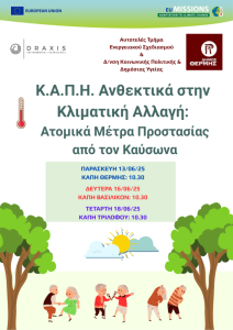 Στο πλαίσιο των δράσεων της Ευρωπαϊκής Αποστολής για την Προσαρμογή στην Κλιματική Αλλαγή, ο δήμος Θέρμης μέσω του Αυτοτελούς Τμήματος Ενεργειακού Σχεδιασμού & της Διεύθυνσης Κοινωνικής Πολιτικής & Δημόσιας Υγείας διοργανώνει σειρά ενημερωτικών εκδηλώσεων με θέμα: “Κ.Α.Π.Η. Ανθεκτικά στην Κλιματική Αλλαγή – Ατομικά Μέτρα Προστασίας από τον Καύσωνα”.