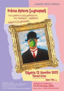 Ο Δήμος Νέας Ιωνίας σας προσκαλεί στα εγκαίνια της ετήσιας Έκθεσης Ζωγραφικής των μαθητών και μαθητριών, των παιδικών και εφηβικών, Τμημάτων Ζωγραφικής, που θα πραγματοποιηθούν την Πέμπτη 12 Ιουνίου 2025 και ώρα 19:30, στον φιλόξενο χώρο του Παναιτωλίου.