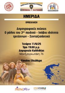 ΚεντρικήΚοινωνικάΗμερίδα για το δημογραφικό πρόβλημα by xristiana9 Ιουνίου 202510 Ιουνίου 20250155 Share00 9/6/2025 Ημερίδα για το δημογραφικό πρόβλημα με τίτλο «Δημογραφικές πιέσεις Ο ρόλος του 3ου παιδιού – Ισόβια ιδιότητα τριτέκνων – Συνταξιοδοτικό» – Τετάρτη 11/6/25 19:00 στην Αίθουσα του Δημοτικού Συμβουλίου Καλλιθέας.