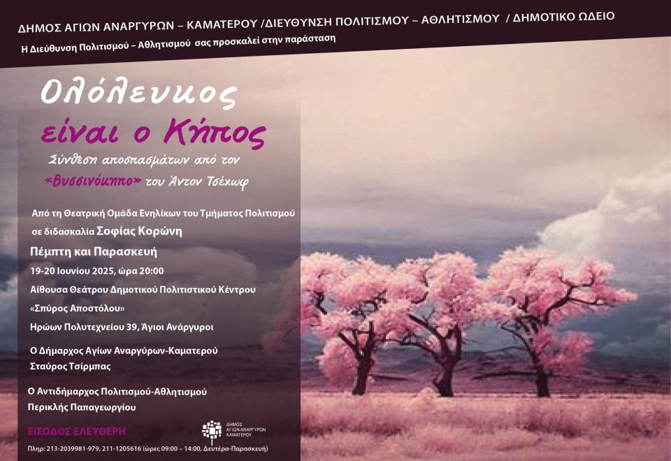 ΚεντρικήΚοινωνικάΘεατρική παράσταση by xristiana19 Ιουνίου 202519 Ιουνίου 20250111 Share00 19/6/2025 Ενημερώνουμε ότι την Πέμπτη 19 και την Παρασκευή 20 Ιουνίου και ώρα 20.00 θα πραγματοποιηθεί η θεατρική παράσταση με τίτλο: «Ολόλευκος είναι ο κήπος» στο Πολιτιστικό Κέντρο «Σπύρος Αποστόλου».