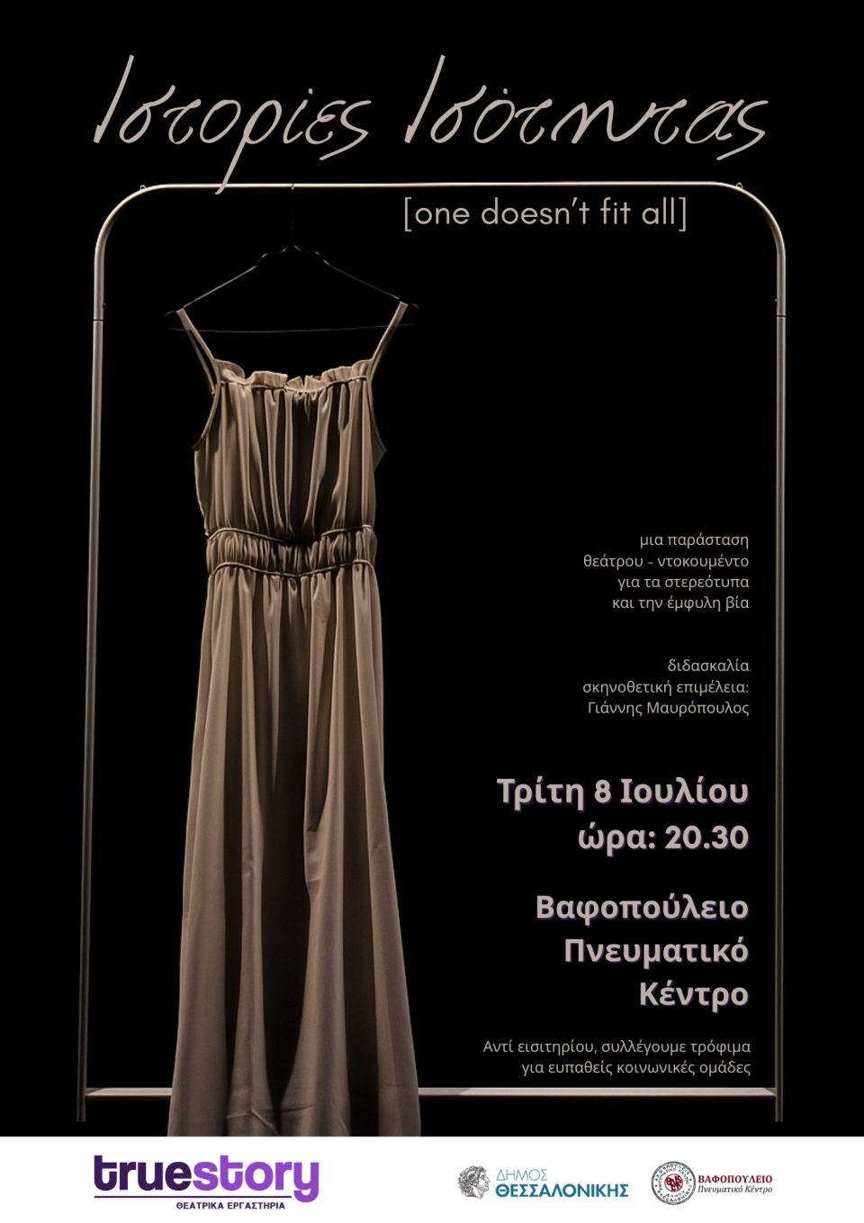 Παράσταση θεάτρου-ντοκουμέντο με τίτλο «Ιστορίες Ισότητας (one doesn’t fit all)» διοργανώνει την Τρίτη 8 Ιουλίου 2025 το Βαφοπούλειο Πνευματικό Κέντρο σε συνεργασία με την Εταιρεία Θεάτρου TrueStory ΑΜΚΕ (πρώην MONKS).