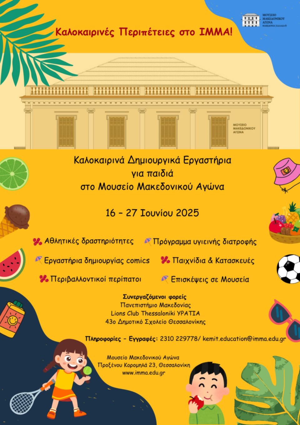 Το Ίδρυμα Μουσείου Μακεδονικού Αγώνα και της Νεότερης Ιστορίας της Μακεδονίας (ΙΜΜΑ), προσκαλεί όλα τα παιδιά της πόλης στα καθιερωμένα καλοκαιρινά εργαστήρια του Μουσείου που θα πραγματοποιηθούν από τις 16 έως τις 27 Ιουνίου 2025!