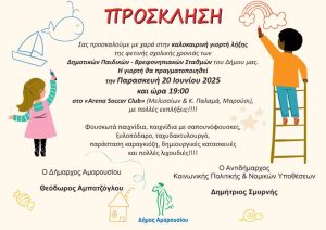 Ο Δήμαρχος Αμαρουσίου Θεόδωρος Αμπατζόγλου και ο Αντιδήμαρχος Κοινωνικής Πολιτικής και Νομικών Υποθέσεων Δημήτρης Σμυρνής σας προσκαλούν με χαρά στην Καλοκαιρινή Γιορτή των Δημοτικών-Βρεφονηπιακών Σταθμών, με την ευκαιρία της λήξης της φετινής σχολικής χρονιάς.
