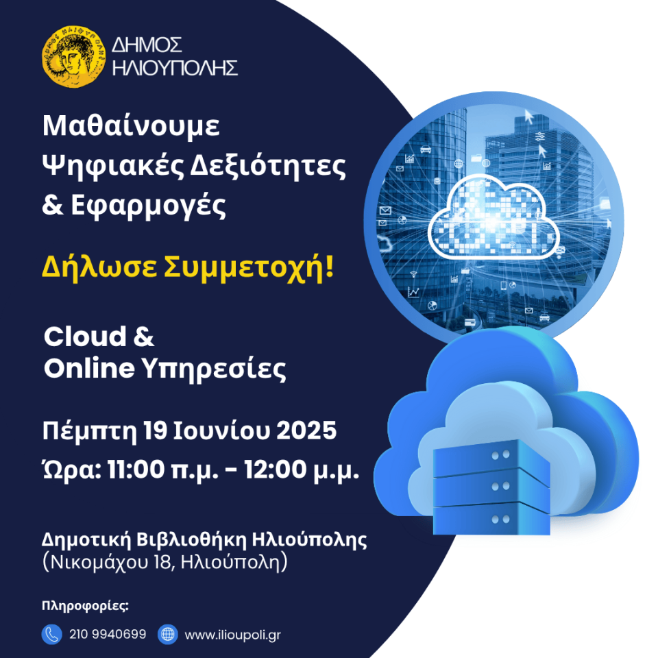 Συγκεκριμένα την Πέμπτη 19 Ιουνίου 2025 στις 11:00 π.μ. – 12:00 μ.μ., θα πραγματοποιηθεί στις εγκαταστάσεις του Media Lab της Δημοτικής Βιβλιοθήκης Ηλιούπολης συνάντηση με θέμα “Cloud & Online Υπηρεσίες”.