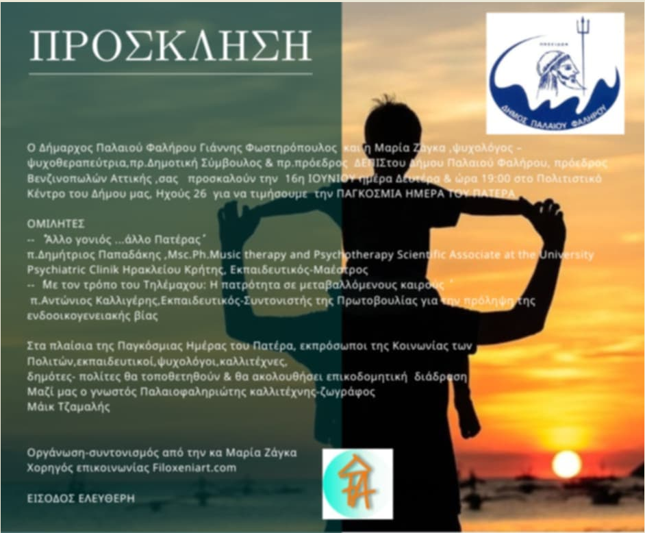Ο Δήμαρχος Παλαιού Φαλήρου Γιάννης Φωστηρόπουλος και η Μαρία Ζάγκα, ψυχολόγος-ψυχοθεραπεύτρια, πρ.Δημοτική Σύμβουλος & πρ.πρόεδρος ΔΕΠΙΣ του Δήμου Παλαιού Φαλήρου, πρόεδρος Βενζινοπωλών Αττικής, σας προσκαλούν την 16η ΙΟΥΝΙΟΥ ημέρα Δευτέρα & ώρα 19:00 στο Πολιτιστικό Κέντρο του Δήμου μας, Ηχούς 26 για να τιμήσουμε την ΠΑΓΚΟΣΜΙΑ ΗΜΕΡΑ ΤΟΥ ΠΑΤΕΡΑ.