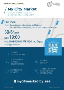 Ο Δήμος Νέας Ιωνίας & το Επαγγελματικό Επιμελητήριο Αθηνών σας προσκαλούν στην παρουσίαση της πλατφόρμας MyCityMarket τη Δευτέρα 30/6, στις 19:00, στο Συνεδριακό Κέντρο Δήμου Ν. Ιωνίας (Π. Ιωακείμ 4).
