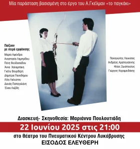Την Κυριακή, 22 Ιουνίου 2025 στις 21.00, ο Δήμος Λυκόβρυσης-Πεύκης θα παρουσιάσει στο Θέατρο του Πνευματικού Κέντρου Λυκόβρυσης την παράσταση «Ρομάντζο» που είναι βασισμένη στο έργο του Α. Γκέλμαν «Το Παγκάκι».