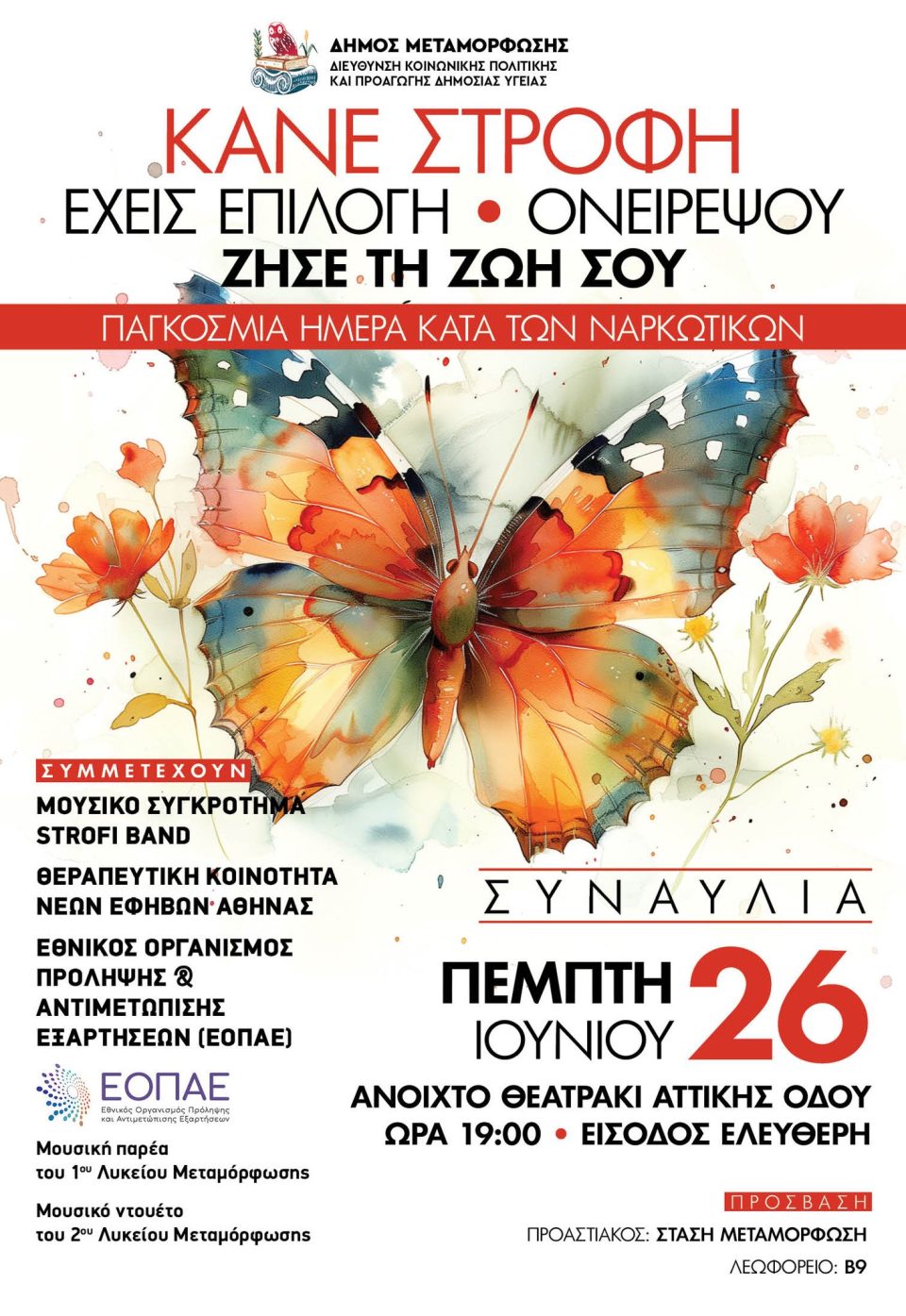 Στα πλαίσια της Παγκόσμιας Ημέρας Κατά των Ναρκωτικών, η Δ/νση Κοινωνικής Πολιτικής & Προαγωγής της Δημόσιας Υγείας του Δήμου Μεταμόρφωσης σε συνεργασία με τη Θεραπευτική Κοινότητα Νέων Εφήβων Αθήνας (ΕΟΠΑΕ) σας προσκαλεί σε συναυλία την Πέμπτη 26 Ιουνίου 2025 και ώρα 19:00, στο Ανοικτό Θεατράκι του Σκεπαστού της Αττικής Οδού.