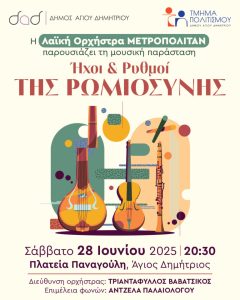 Η λαϊκή ορχήστρα “Μετροπόλιταν” παρουσιάζει τη συναυλία «Ήχοι και Ρυθμοί της Ρωμιοσύνης», στις 28 Ιουνίου, στις 20:30 στην Πλατεία Αλ. Παναγούλη. Ένα μουσικό ταξίδι αφιερωμένο σε εμβληματικά έργα του Γιάννη Μαρκόπουλου, καθώς και σε επιλεγμένες συνθέσεις των Μάνου Χατζιδάκι και Μίκη Θεοδωράκη.