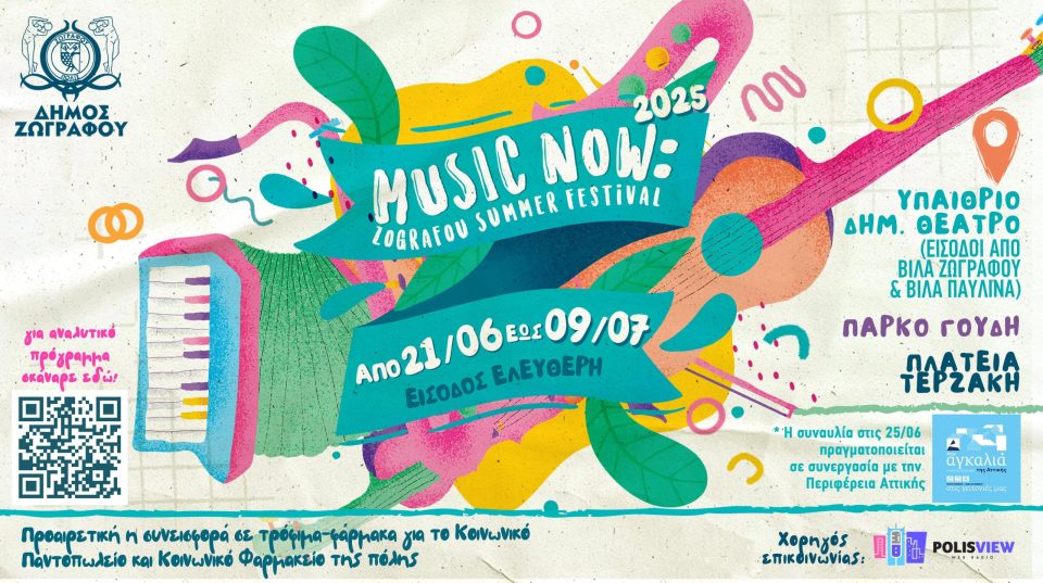 Το επιτυχημένο καλοκαιρινό φεστιβάλ μουσικής Music Now! Ζωγράφου Summer Festivalέρχεται και φέτος στο Δήμο Ζωγράφου! Ξεκινά, τιμώντας την Ευρωπαϊκή Γιορτή της Μουσικής στις 21 Ιουνίου και θα διαρκέσει μέχρι και τις 9 Ιουλίου!