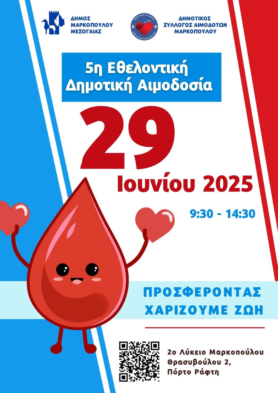 Ο Δήμος Μαρκοπούλου σας καλεί να συμμετάσχετε στην 5η εθελοντική Δημοτική Αιμοδοσία, που διοργανώνει ο Δημοτικός Σύλλογος Αιμοδοτών Μαρκοπούλου, σε συνεργασία με το Γενικό Νοσοκομείο Αθηνών «Ο Ευαγγελισμός» και την υποστήριξη της Κοινωνικής Υπηρεσίας του Δήμου, την Κυριακή 29 Ιουνίου 2025, από τις 9.30 το πρωί έως τις 14.30 το μεσημέρι, στις εγκαταστάσεις του 2ου Λυκείου Μαρκοπούλου, επί της οδού Θρασυβούλου 2, στην περιοχή του Πόρτο Ράφτη.