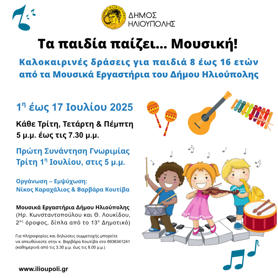 Τα Μουσικά Εργαστήρια του Δήμου Ηλιούπολης προσκαλούν τα παιδιά, ηλικίας 8 έως 16 ετών, που παίζουν κάποιο μουσικό όργανο, να συμμετέχουν στις καλοκαιρινές δράσεις τους.
