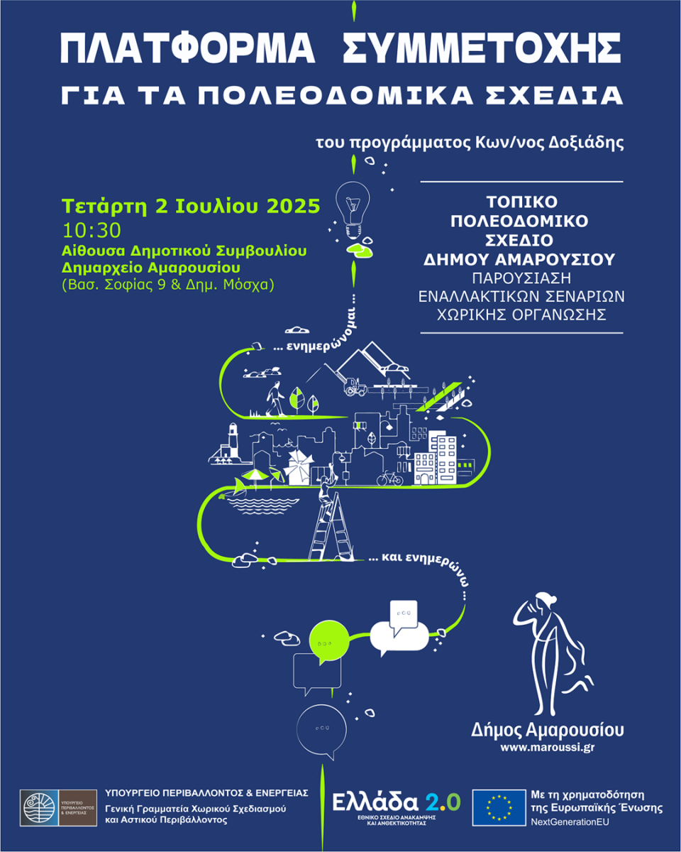 Ο Δήμος Αμαρουσίου προσκαλεί τους ενδιαφερόμενους πολίτες, την Τετάρτη 2 Ιουλίου 2025, και ώρα 10:30, στην αίθουσα Δημοτικού Συμβουλίου του Δημαρχείου Αμαρουσίου (Βασ.Σοφίας 9 και Δημ.Μόσχα) στην παρουσίαση των εναλλακτικών σεναρίων της Μελέτης «Τοπικό Πολεοδομικό Σχέδιο (ΤΠΣ) Δήμου Αμαρουσίου», που εκπονείται στο πλαίσιο του Εθνικού Προγράμματος Πολεοδομικής Μεταρρύθμισης “Κωνσταντίνος Δοξιάδης”. Τα ΤΠΣ υλοποιούνται από το Υπουργείο Περιβάλλοντος και Ενέργειας (Υ.Π.ΕΝ), με την συνδρομή του ΤΕΕ και χρηματοδότηση από το Ταμείο Ανάκαμψης και Ανθεκτικότητας.