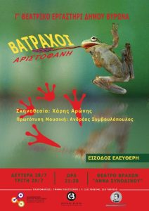 Ο Δήμος Βύρωνα και το Τμήμα Πολιτισμού παρουσιάζουν την παράσταση «Βάτραχοι» του Αριστοφάνη, από το Γ’ Θεατρικό Εργαστήρι του Δήμου Βύρωνα, σε σκηνοθεσία του Χάρη Αρώνη.