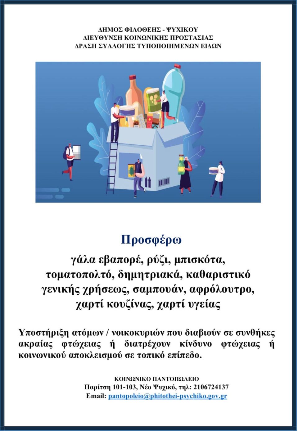 Ο Δήμος Φιλοθέης – Ψυχικού και η Διεύθυνση Κοινωνικής Προστασίας, οργανώνει δράση συγκέντρωσης τροφίμων και ειδών πρώτης ανάγκης για την ενίσχυση του Κοινωνικού Παντοπωλείου.