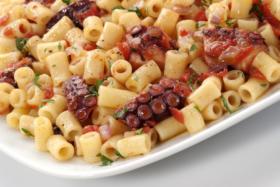Ψήνουμε για περίπου 50 λεπτά. Ελέγχουμε αν έχει ψηθεί το χταπόδι. Αν ναι, προσθέτουμε 2 φλ. νερό και ρίχνουμε το κοφτό μακαρονάκι στο σκεύος. Ανακατεύουμε.