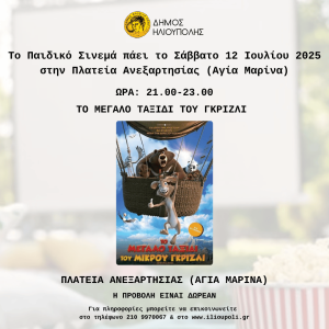 Το Παιδικό Σινεμά συνεχίζει την “περιοδεία” του με τη ΔΩΡΕΑΝ προβολή της παιδικής ταινίας “ΤΟ ΜΕΓΑΛΟ ΤΑΞΙΔΙ ΤΟΥ ΓΚΡΙΖΛΙ” το Σάββατο 12 Ιουλίου 2025 στις 21:00