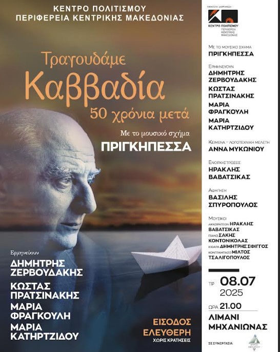 Το Κέντρο Πολιτισμού Περιφέρειας Κεντρικής Μακεδονίας σε συνεργασία με το Δήμο Θερμαϊκού παρουσιάζουν μια βραδιά ποίησης και μουσικής αφιερωμένη στον ποιητή Νίκο Καββαδία «Τραγουδάμε Καββαδία – 50 χρόνια μετά…», που φέτος συμπληρώνονται 50 χρόνια από τον θάνατο του. Η εκδήλωση θα πραγματοποιηθεί στις 8 Ιουλίου, στο λιμάνι Μηχανιώνας (είσοδος ελεύθερη, χωρίς κρατήσεις), στις 21.00.