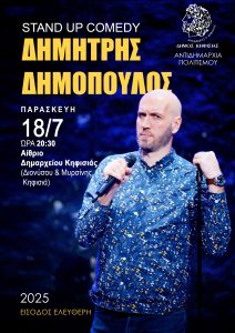 Ο ηθοποιός, σκηνοθέτης αλλά και stand up κωμικός, Δημήτρης Δημόπουλος, υπόσχεται να μας χαρίσει στιγμές γέλιου, χαλάρωσης αλλά και απολαυστικής απόδοσης της πραγματικότητας που αντιμετωπίζει ο σύγχρονος άνθρωπος, την Παρασκευή 18 Ιουλίου, στις 20.30, στο Αίθριο του Δημαρχείου Κηφισιάς (Διονύσου & Μυρσίνης, Κηφισιά) στη μοναδική παράσταση Stand Up Comedy που διοργανώνει η Αντιδημαρχία Πολιτισμού στο πλαίσιο του πολιτιστικού θεσμού «Επί Σκηνής – Καλοκαίρι στην Κηφισιά».