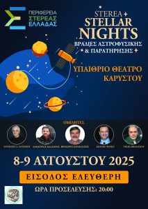 H Περιφέρεια Στερεάς Ελλάδας διοργανώνει σε συνεργασία με τον Δήμο Καρύστου το 3ο Φεστιβάλ Αστροφυσικής και Παρατήρησης Νυχτερινού Ουρανού. Το Φεστιβάλ θα πραγματοποιηθεί το διήμερο 08 και 09 Αυγούστου στο Υπαίθριο Θέατρο Καρύστου.