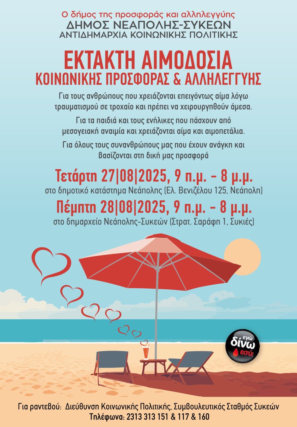 Η έκτακτη Εθελοντική Αιμοδοσία του καλοκαιριού θα διεξαχθεί την Τετάρτη 27 και την Πέμπτη 28 Αυγούστου από τις 9 το πρωί έως τις 8 βράδυ στο δημοτικό κατάστημα Νεάπολης (Ελ. Βενιζέλου 125, Νεάπολη) και στο δημαρχείο Νεάπολης-Συκεών (Ι. Μιχαήλ και Στρ. Σαράφη 1, Συκιές) σε συνεργασία με τις κινητές μονάδες αιμοληψίας των νοσοκομείων ΑΧΕΠΑ, Ιπποκράτειο και Γ. Παπανικολάου.