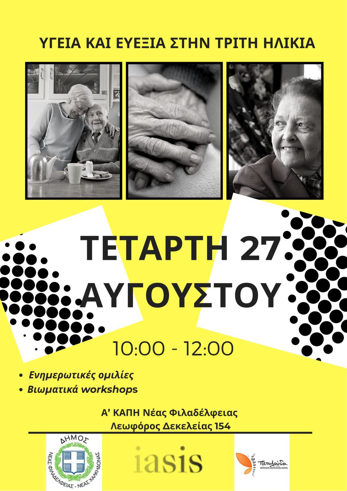 Η δράση με θέμα «Υγεία και Ευεξία στην Τρίτη Ηλικία» θα πραγματοποιηθεί στο Ά ΚΑΠΗ Νέας Φιλαδέλφειας (Λεωφόρος Δεκελείας 154), την Τετάρτη 27 Αυγούστου 2025, 10:00-12:00.