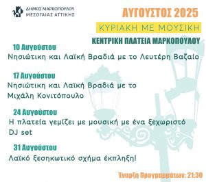 Ο Δήμος Μαρκοπούλου Μεσογαίας μεταμορφώνει τις Κυριακές 10, 17, 24, και 31 του Αυγούστου 2025 σε γιορτή και σας προσκαλεί στην Κεντρική Πλατεία Μαρκοπούλου, για να απολαύσουμε μουσικά τον τελευταίο μήνα του Καλοκαιριού.