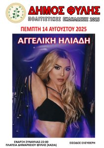 Την παραμονή της μεγάλης γιορτής το βράδυ της Πέμπτης 14 Αυγούστου 2025, η Φυλή θα υποδεχθεί την σπουδαία λαϊκή ερμηνεύτρια Αγγελική Ηλιάδη.