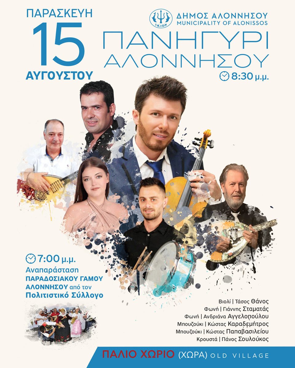 Οι εκδηλώσεις θα ξεκινήσουν από τις 19:00 με την αναπαράσταση του Παραδοσιακού Γάμου Αλοννήσου από τον Πολιτιστικό Σύλλογο Αλοννήσου και στις 20:30 ξεκινά το μεγάλο πανηγύρι με ζωντανή μουσική και χορό μέχρι το πρωί!