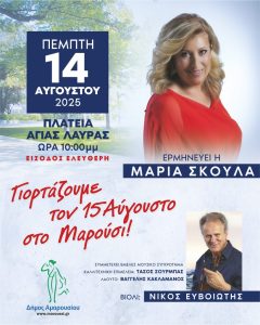 Μια εορταστική λαϊκή και παραδοσιακή βραδιά σας περιμένει την Πέμπτη, 14 Αυγούστου 2025, στις 10:00 μ.μ στην Πλατεία Αγίας Λαύρας (Λεωφ. Κηφισίας 187, Μαρούσι) στο πλαίσιο του εορτασμού του 15Αύγουστου στον Δήμο Αμαρουσίου.
