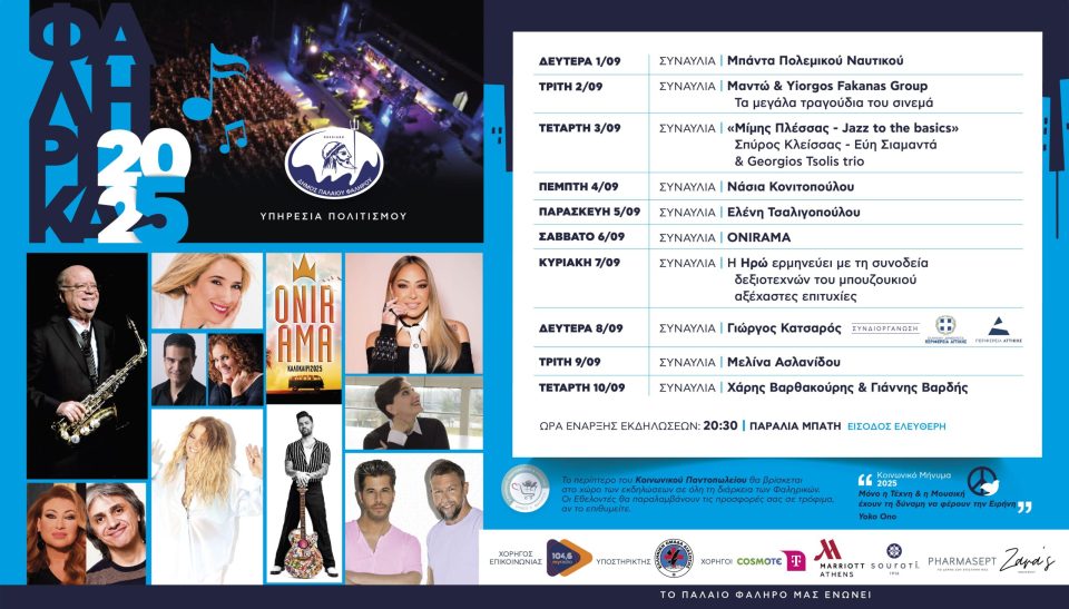 Η έναρξη των Φαληρικών θα σημάνει με την εμβληματική Μπάντα του Πολεμικού Ναυτικού και θα συνεχιστεί με καλλιτέχνες που υπηρετούν με συνέπεια και ποιότητα το Ελληνικό τραγούδι.