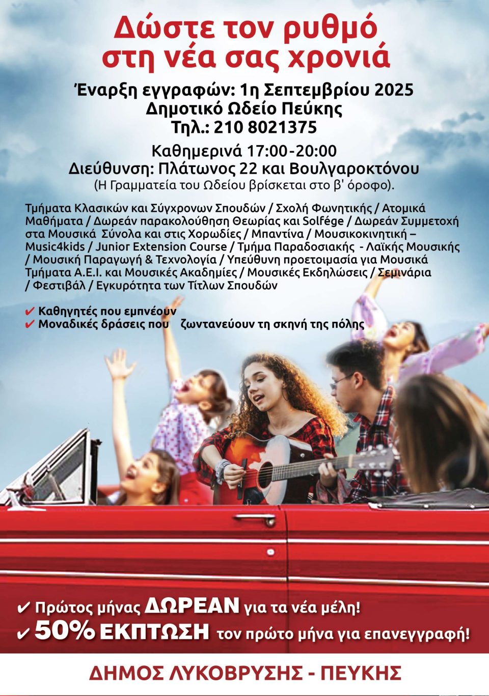 Ο Δήμος Λυκόβρυσης – Πεύκης και το Δημοτικό Ωδείο Πεύκης ανακοινώνουν την έναρξη των εγγραφών για το νέο ακαδημαϊκό έτος. Με μακρόχρονη πορεία στην καλλιέργεια της μουσικής παιδείας, το Ωδείο συνεχίζει να αποτελεί θεσμό πολιτισμού και δημιουργίας για την πόλη μας.
