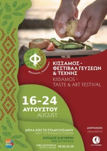 Το Σάββατο 16 Αυγούστου ανοίγει τις πύλες του για 16η χρονιά το Κίσσαμος – Φεστιβάλ Γεύσεων & Τέχνης, και θα διαρκέσει έως και 24 Αυγούστου στον παραλιακό δρόμο δυτικά του Δημοτικού Σταδίου Κισσάμου με ώρες λειτουργίας από 18:30 έως 23:30.