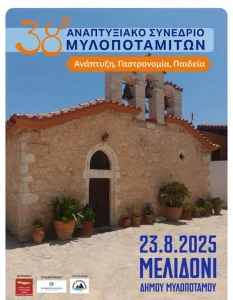 Η «Πανελλήνια Πολιτιστική Ένωση Μυλοποταμιτών», με τη στήριξη της Περιφέρειας Κρήτης και υπό την αιγίδα του Δήμου Μυλοποτάμου, πραγματοποιεί το 38ο Αναπτυξιακό Συνέδριο Μυλοποταμιτών, το Σάββατο 23 Αυγούστου 2025 και ώρα 10.00 το πρωί στο χωριό Μελιδόνι της Δημοτικής Κοινότητας Μελιδονίου, του Δήμου Μυλοποτάμου. Βασικά θέματα που θα απασχολήσουν το συνέδριο θα είναι «Η Ανάπτυξη, η Γαστρονομία και η Παιδεία».