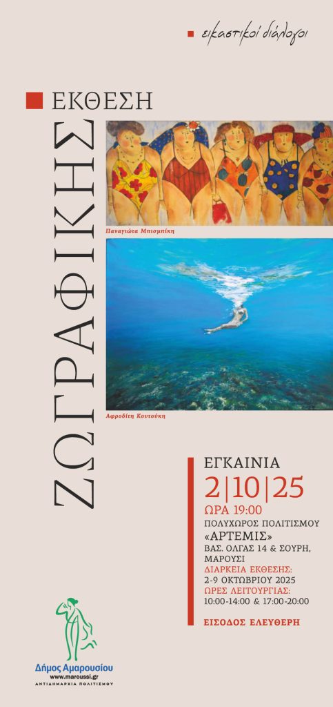 Ο Δήμαρχος Αμαρουσίου Θεόδωρος Αμπατζόγλου και ο Αντιδήμαρχος Πολιτισμού Νικόλαος Πέππας σας προσκαλούν στα Εγκαίνια της Έκθεσης Ζωγραφικής «Εικαστικοί Διάλογοι», των εικαστικών Παναγιώτας Μπισμπίκη και Αφροδίτης Κουτούκη, την Πέμπτη 2 Οκτωβρίου 2025 και ώρα 19:00 στον Πολυχώρο Πολιτισμού «ΑΡΤΕΜΙΣ» (Βασ. Όλγας 14 & Σουρή, Μαρούσι).