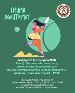 Από τη Δευτέρα 15 Σεπτεμβρίου 2025 ξεκινούν τα Τμήματα Αντισφαίρισης Αρχαρίων για παιδιά και ενήλικες στο Δημοτικό Αθλητικό Κέντρο «Εύα Χριστοδούλου» (Δ.Α.Κ.), Σουλίου 40, Αιγάλεω.