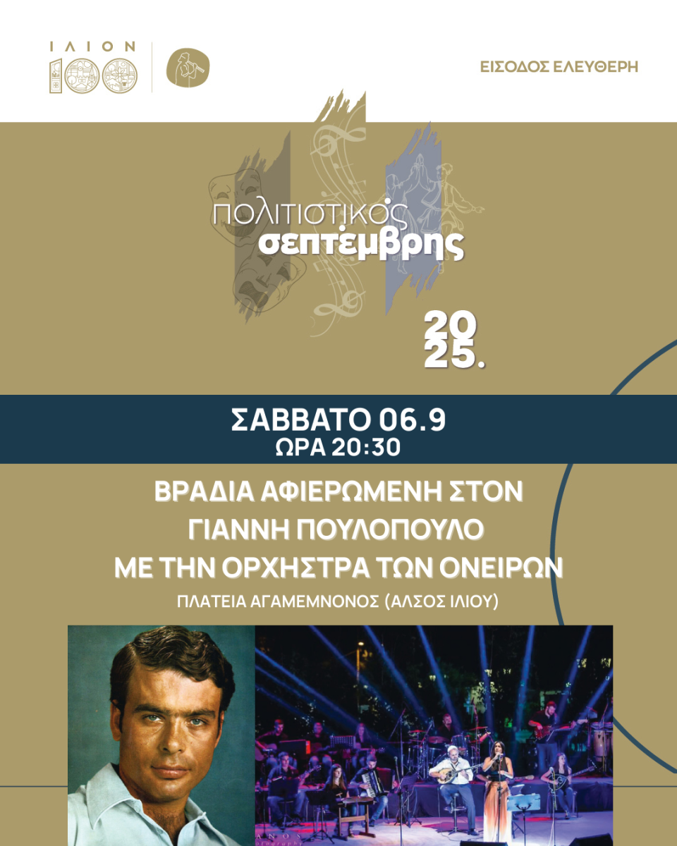 ΚεντρικήΚοινωνικάΒραδιά Αφιερωμένη στον Γιάννη Πουλόπουλο με την Ορχήστρα των Ονείρων by xristiana6 Σεπτεμβρίου 202517 Σεπτεμβρίου 20250114 Share00 6/9/2025