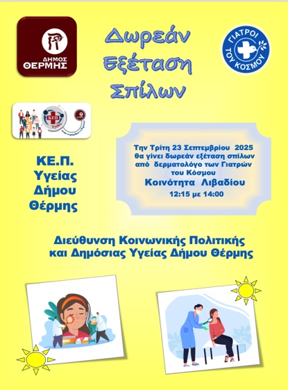ΚεντρικήΚοινωνικάΔωρεάν καταγραφή και εξέταση σπίλων σε Περιστερά και Λιβάδι by xristiana22 Σεπτεμβρίου 202522 Σεπτεμβρίου 2025091 Share00 22/9/2025 Δωρεάν καταγραφή και εξέταση σπίλων από δερματολόγο των Γιατρών του Κόσμου θα πραγματοποιηθεί την Τρίτη 23 Σεπτεμβρίου, στην Κοινότητα Περιστεράς, από τις 09:00 έως τις 12:00 και στην Κοινότητα Λιβαδίου από τις 12:15 έως τις 14:00.