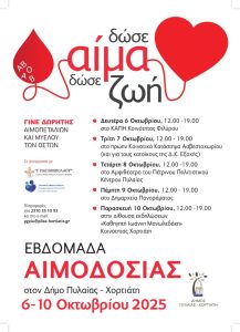 Ο Δήμος Πυλαίας – Χορτιάτη διοργανώνει και φέτος την καθιερωμένη Εβδομάδα Εθελοντικής Αιμοδοσίας και Λήψης Δειγμάτων Μυελού των Οστών, από τη Δευτέρα 06 έως και την Παρασκευή 10 Οκτωβρίου 2025, σε όλες τις δημοτικές ενότητες.